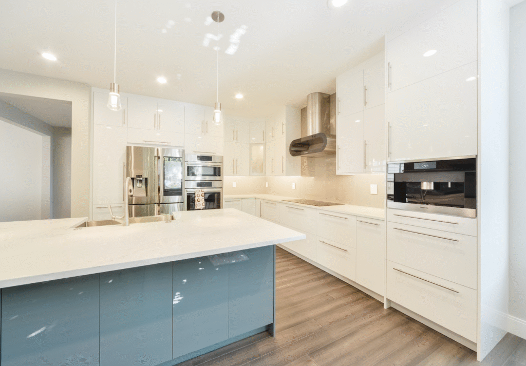 The Remodel: This kitchen is all about minimalism meeting luxury. Glossy white cabinets stretch to the ceiling, creating sleek lines with tons of room for kitchenware, spice, and everything nice. The island, finished in a muted blue-gray tone, gives a subtle splash of color while keeping the palette calm and refined. Stainless steel appliances, pendant lighting, and wide-plank flooring complete the picture — making this kitchen just as functional as it is beautiful. The range hood above the stove gives this kitchen that futuristic look.